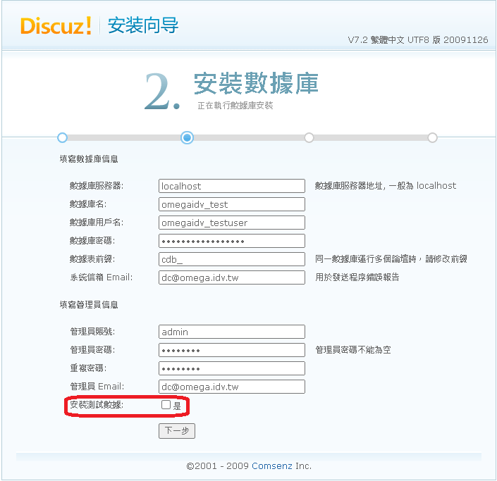 數據庫資料填 forumnew裡的 forum 還原備份資料 omegaidv_test omegaidv_testuser Test@20211102Date 管理員密碼設定 admin@dc 安裝測試數據不要打勾 -> 下一步 |