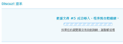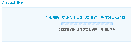 Discuz! 提示 分卷數據第一捲成功導入數據庫,您需要自動導入本次備份的其他分卷嗎? 點 確定 | |