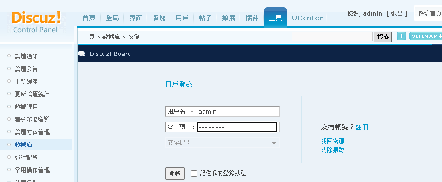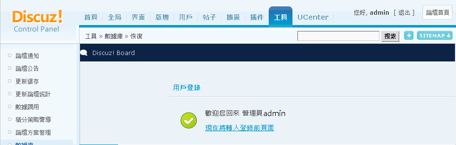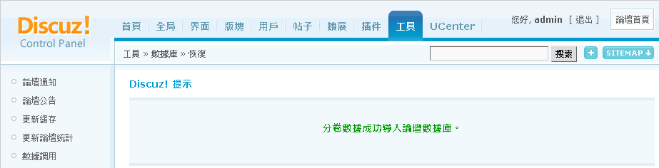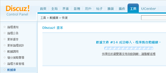 再來回到 管理中心 https://d.omega.idv.tw/forumnew/forum/admincp.php 或是重新整理頁面 回到 工具 -> 數據庫 -> 恢復