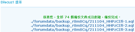 當出現 恭喜您,全部 xx 個備份文件成功創建,備份完成。 整個論壇包含 UCenter 就都備份完畢囉~ 有幾個備份文件依論壇大小而定 | |