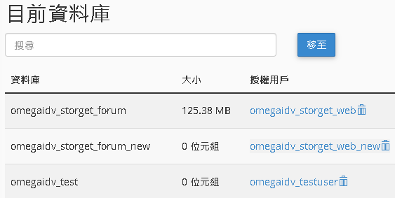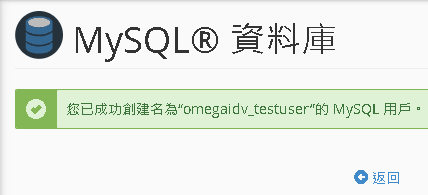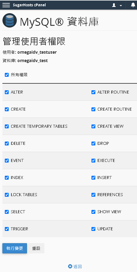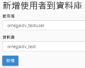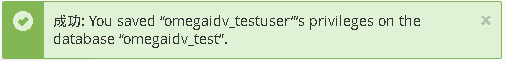新增使用者到資料庫 使用者選 omegdidv_testuser 資料庫選 omegaidv_test 按下新增 | 請勾選 所有權限 -> 執行變更 | 右上角應該會提示建立成功 |