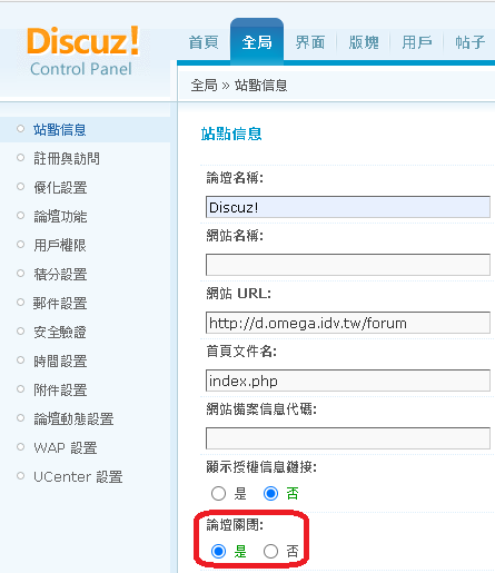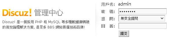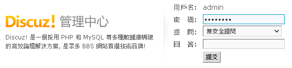 再進入 管理中心 https://d.omega.idv.tw/forumnew/forum/admincp.php 輸入 密碼:admin@dc -> 提交 |