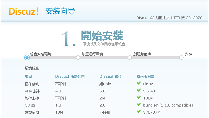 跳過本步 如果是第一次連線會建立 Cache 網頁提示如下 Cache List: settings index ipbanned usergroup_7 style_ Caches successfully created, please refresh. 重新整理頁面後就能看到熟悉的首頁了 |