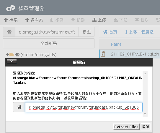 我們要將 DB 備份檔案 211102_ONFvLB-1.sql.zip 上傳並解壓在這裡 | |