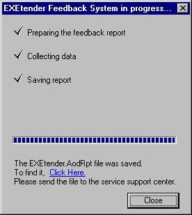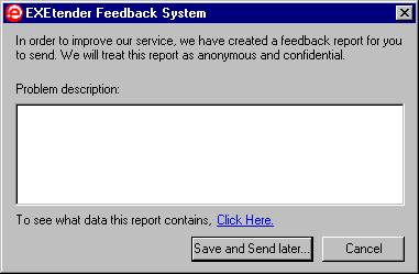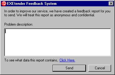 The EXEtender Technical feedback system enables you to report valuable details when a problem occurs. The report is treated as confidential and anonymous, and includes information regarding the various components of the EXEtender system when the problem occurred, the operating system version and the computer hardware in use. There is no collection of files, or any other form of personal information.