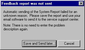 If the sending process did not complete, or encountered a problem, a different dialogue box will be displayed. The information will be saved on your hard drive and you will be asked to email it to the support service center.